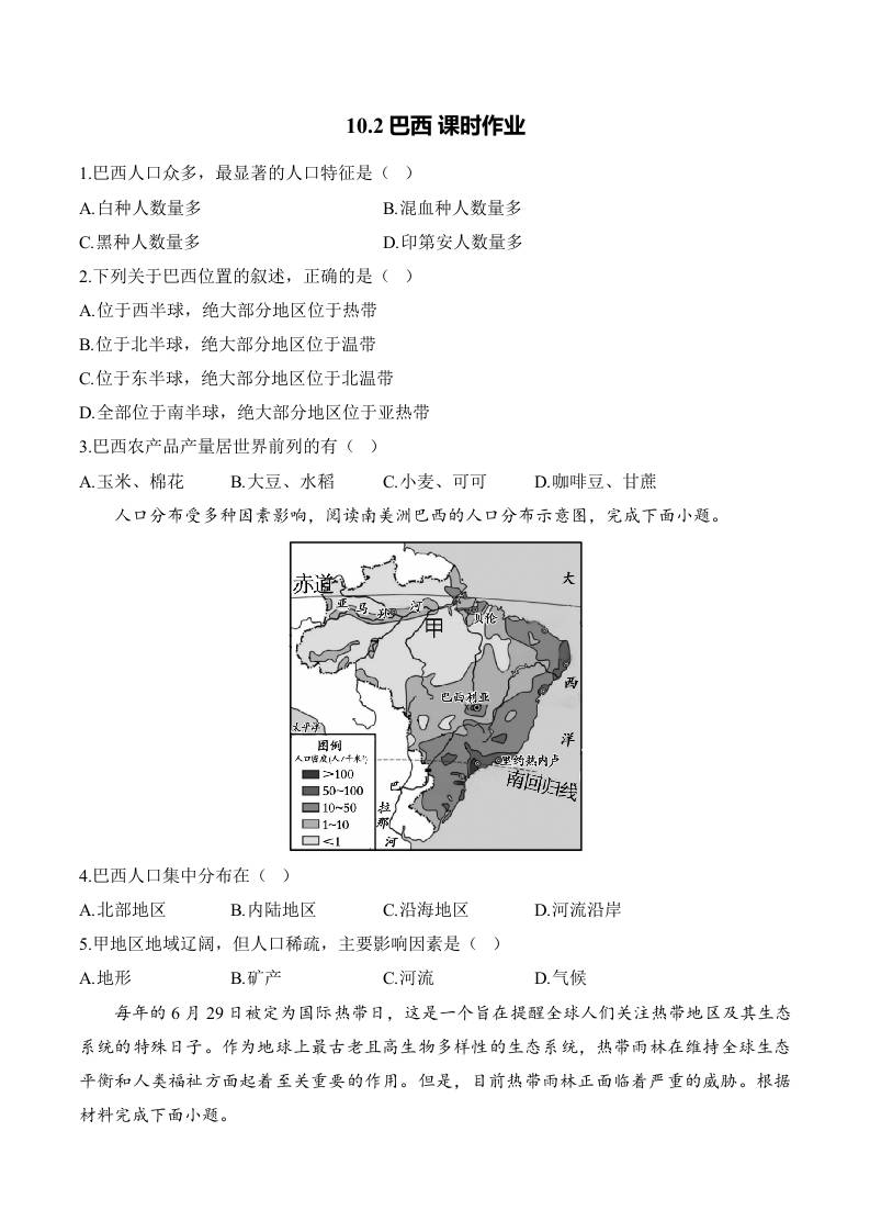 10.2巴西 课时作业(含解析)七年级地理人教版(2024)下册