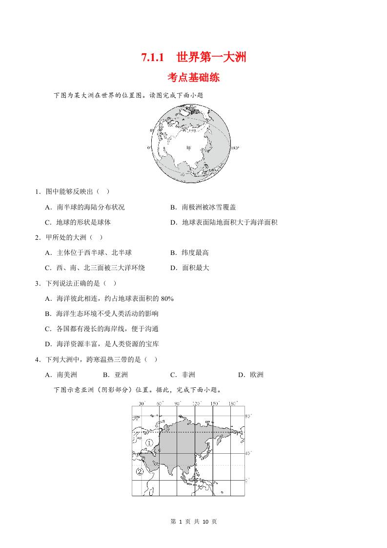 7.1.1世界第一大洲(分层作业)(原卷版)