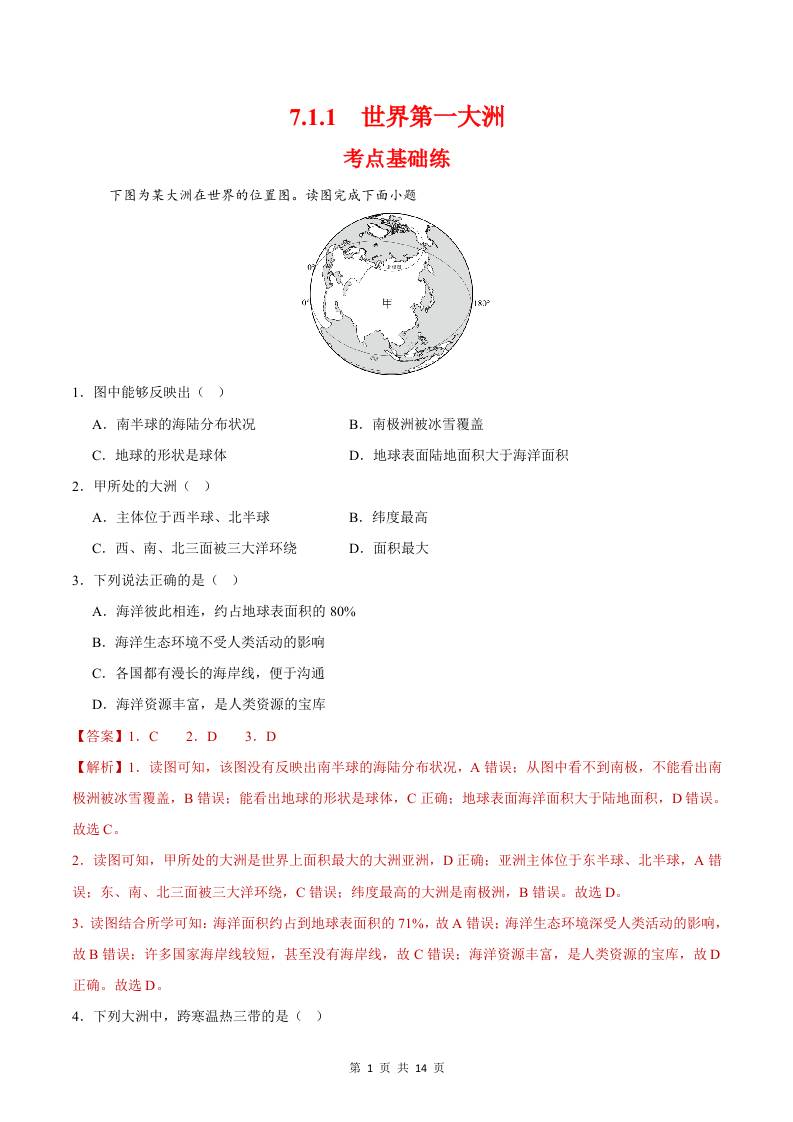 7.1.1世界第一大洲(分层作业)(解析版)