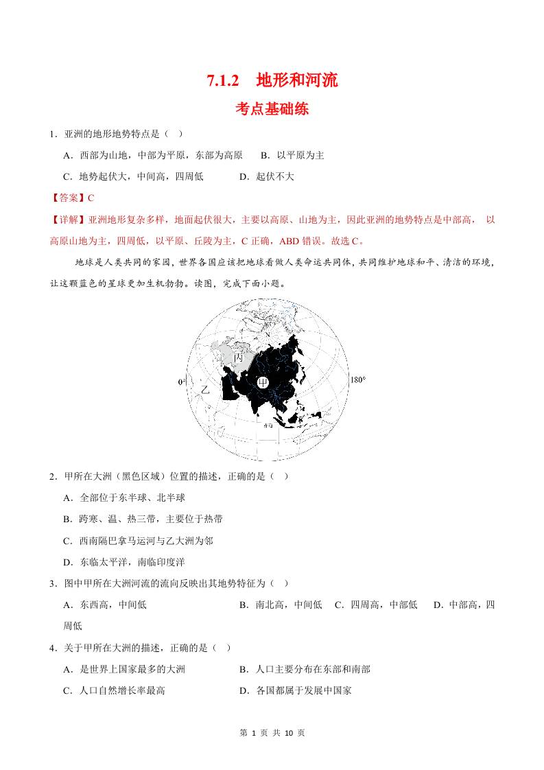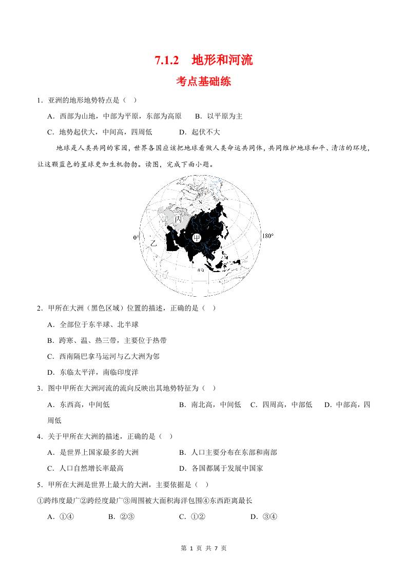 7.1.2地形与河流(分层作业)(原卷版)