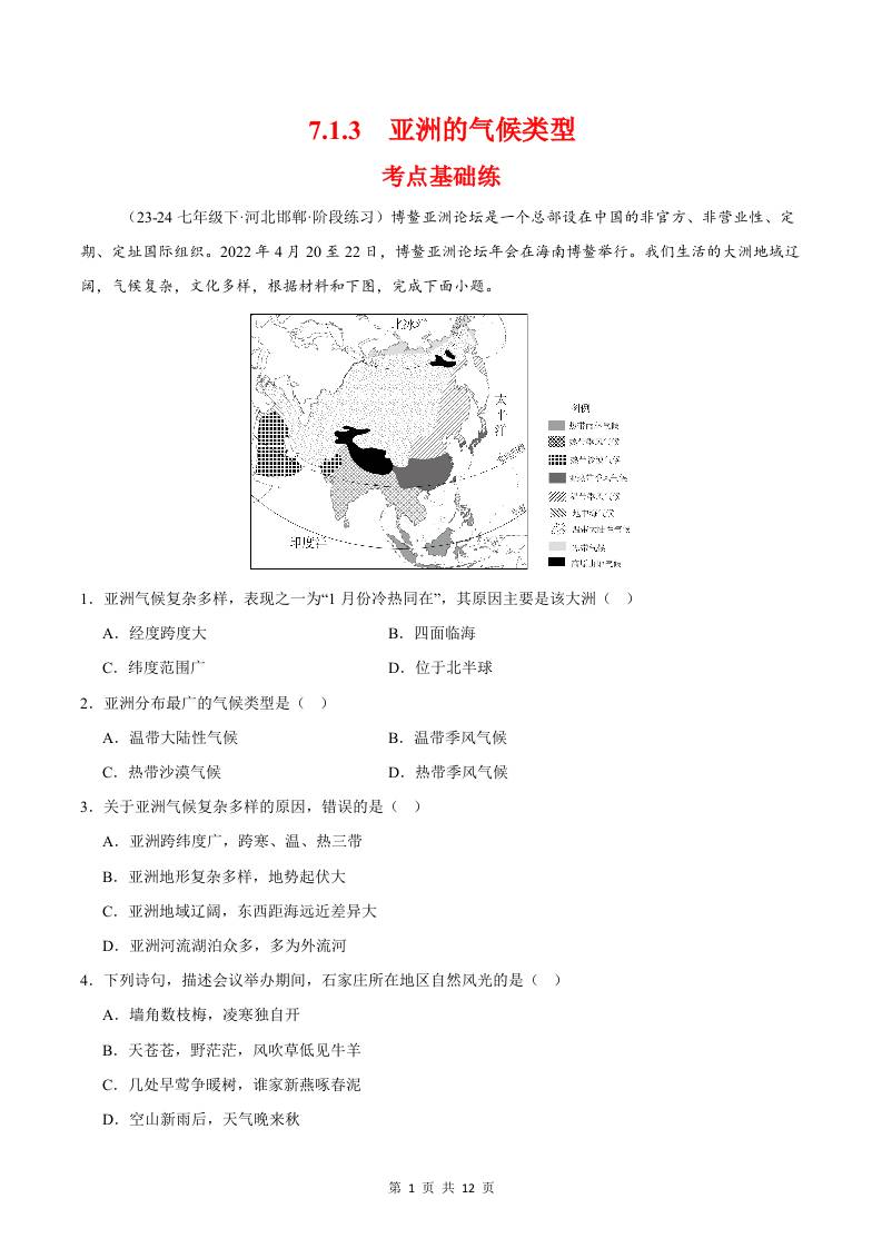 7.1.3气候类型(分层作业)(原卷版)