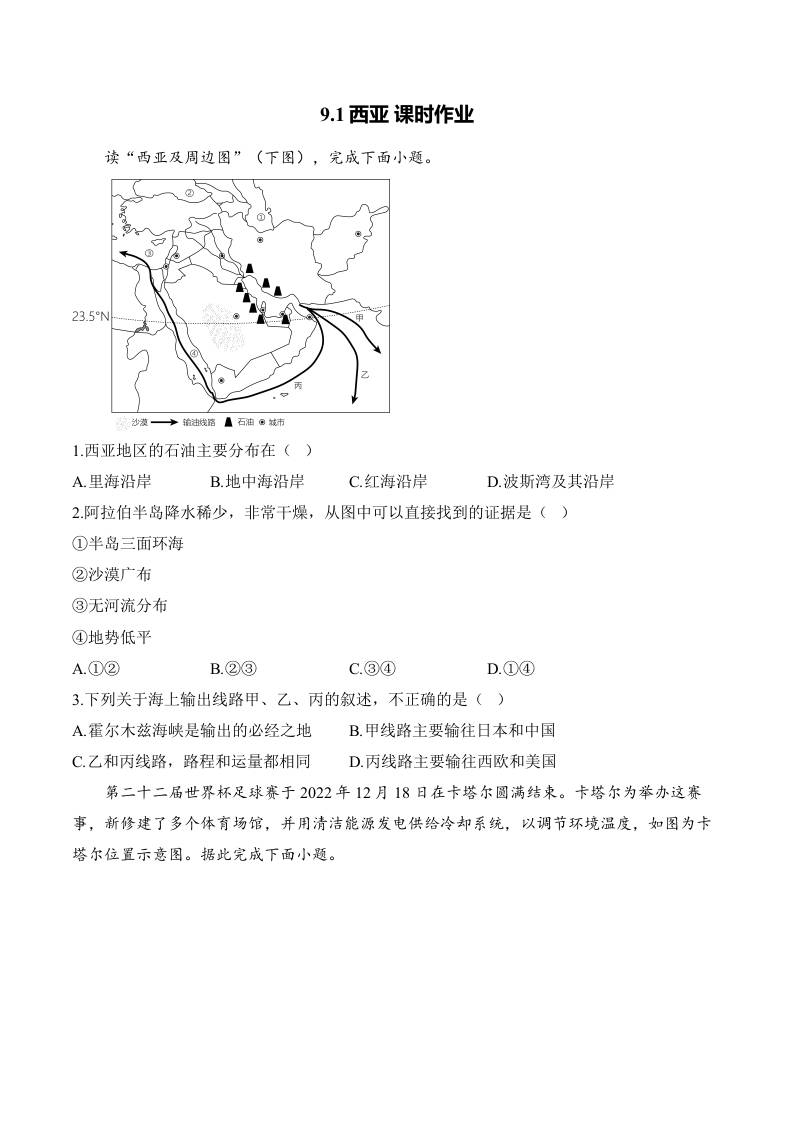 9.1西亚 课时作业(含解析)七年级地理人教版(2024)下册