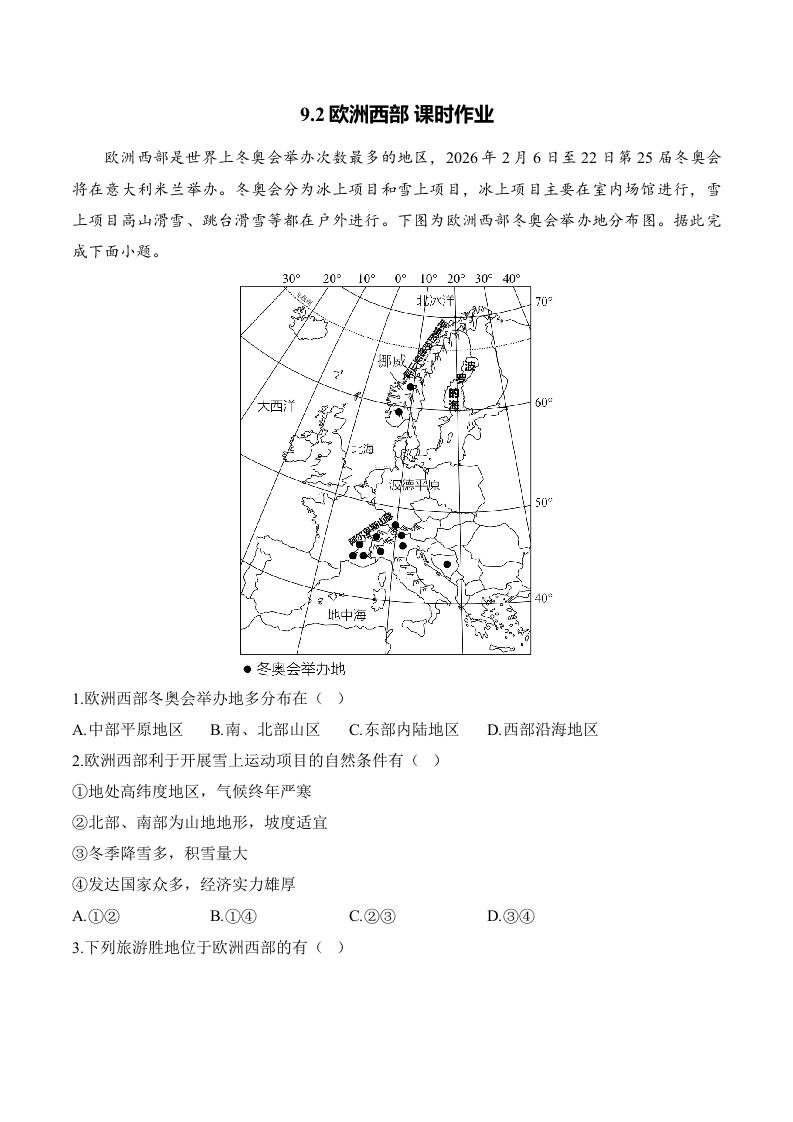 9.2欧洲西部 课时作业(含解析)七年级地理人教版(2024)下册