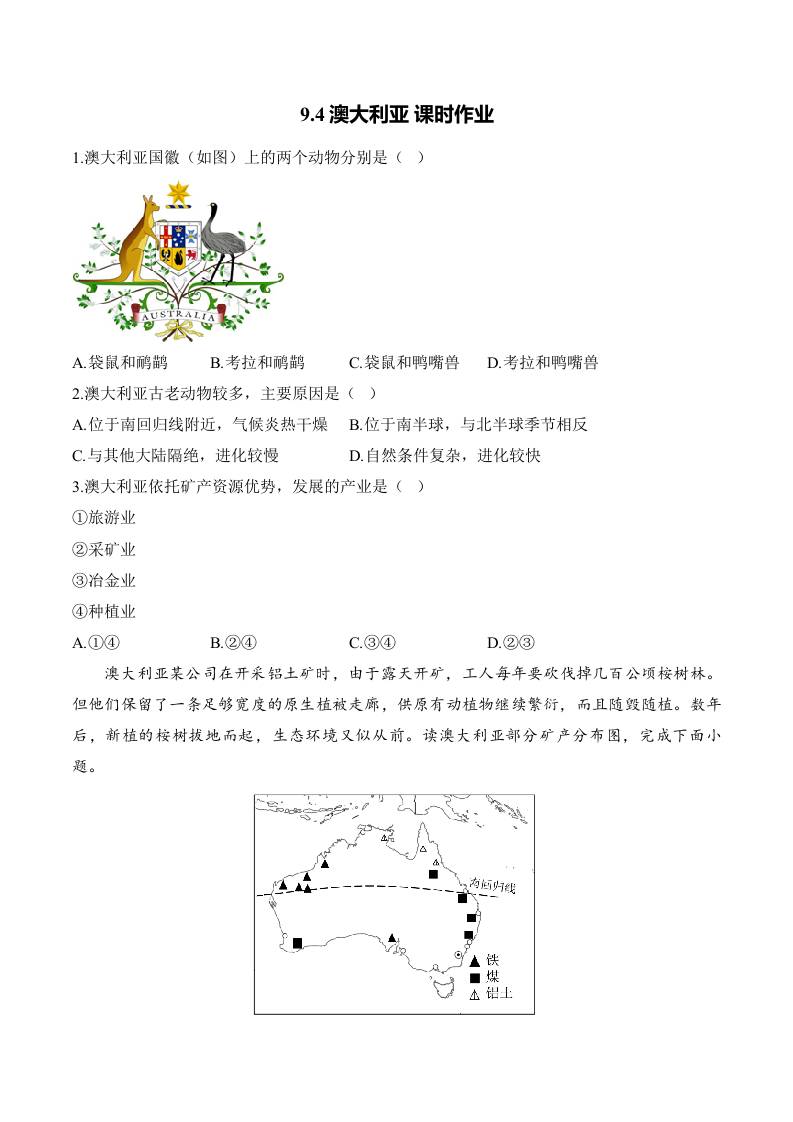 9.4澳大利亚 课时作业(含解析)七年级地理人教版(2024)下册
