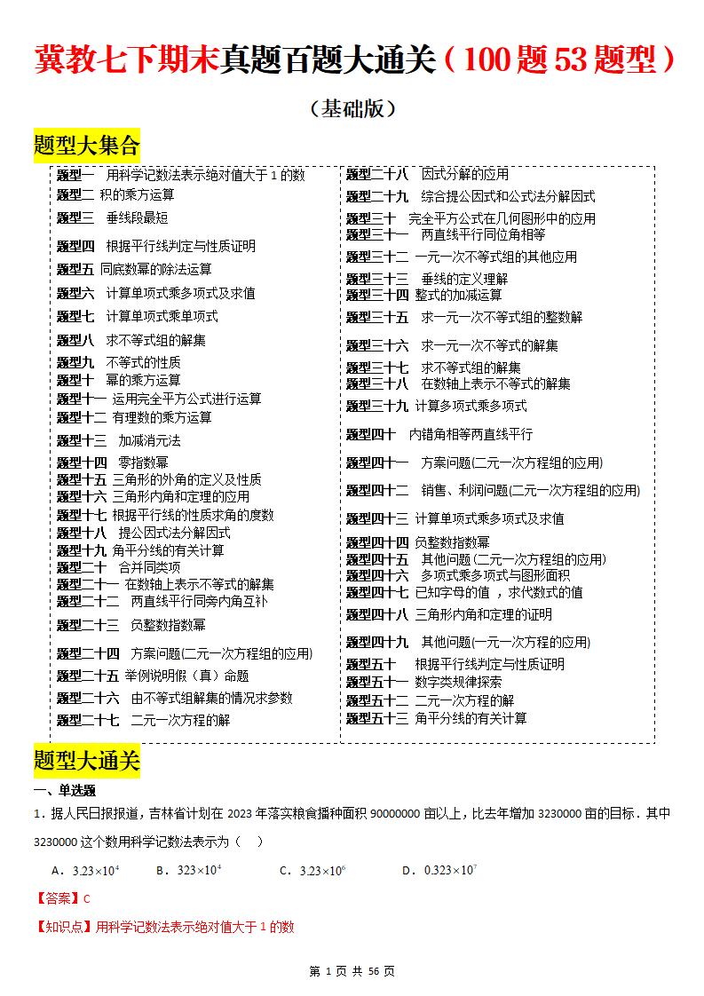 冀教七下期末真题百题大通关(基础版)(解析版)