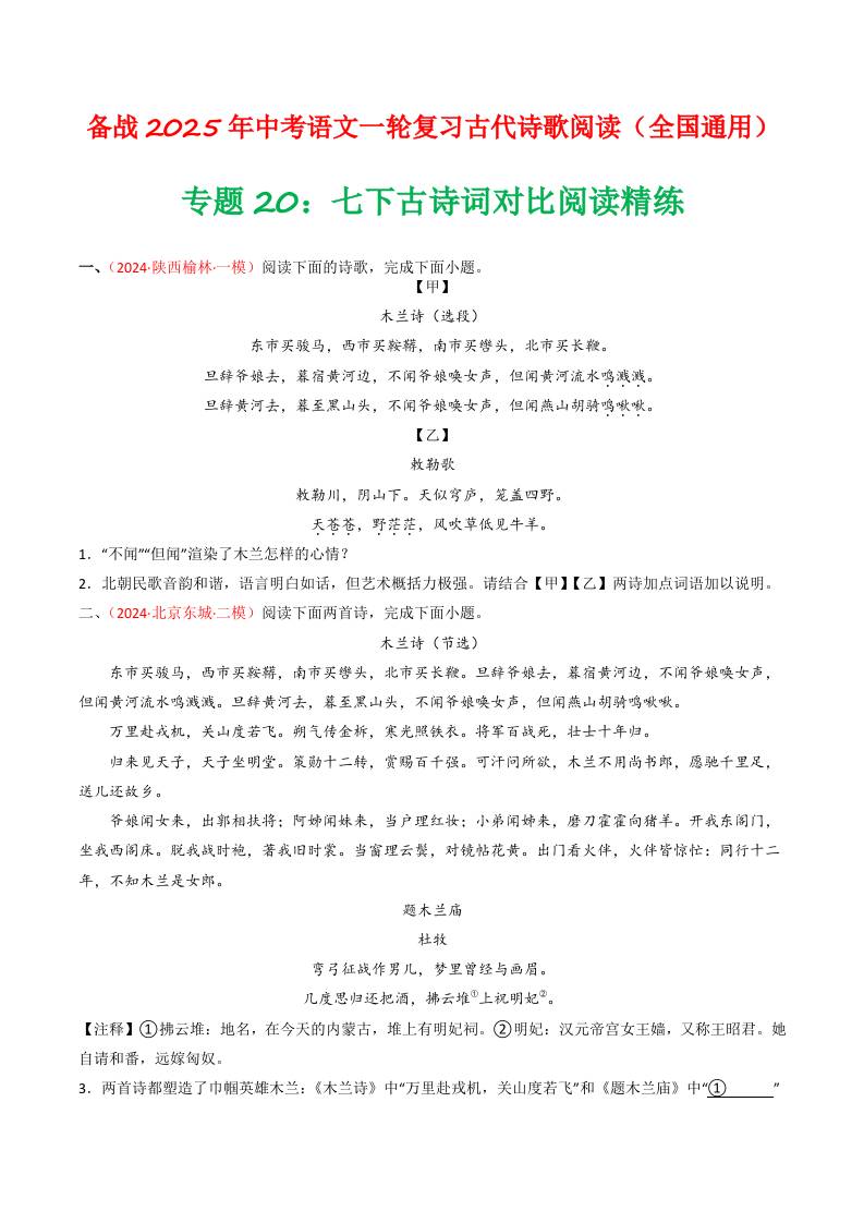 专题20:七下古诗词对比阅读精练-备战2025年中考语文一轮复习古代诗歌阅读(全国通用)原卷版