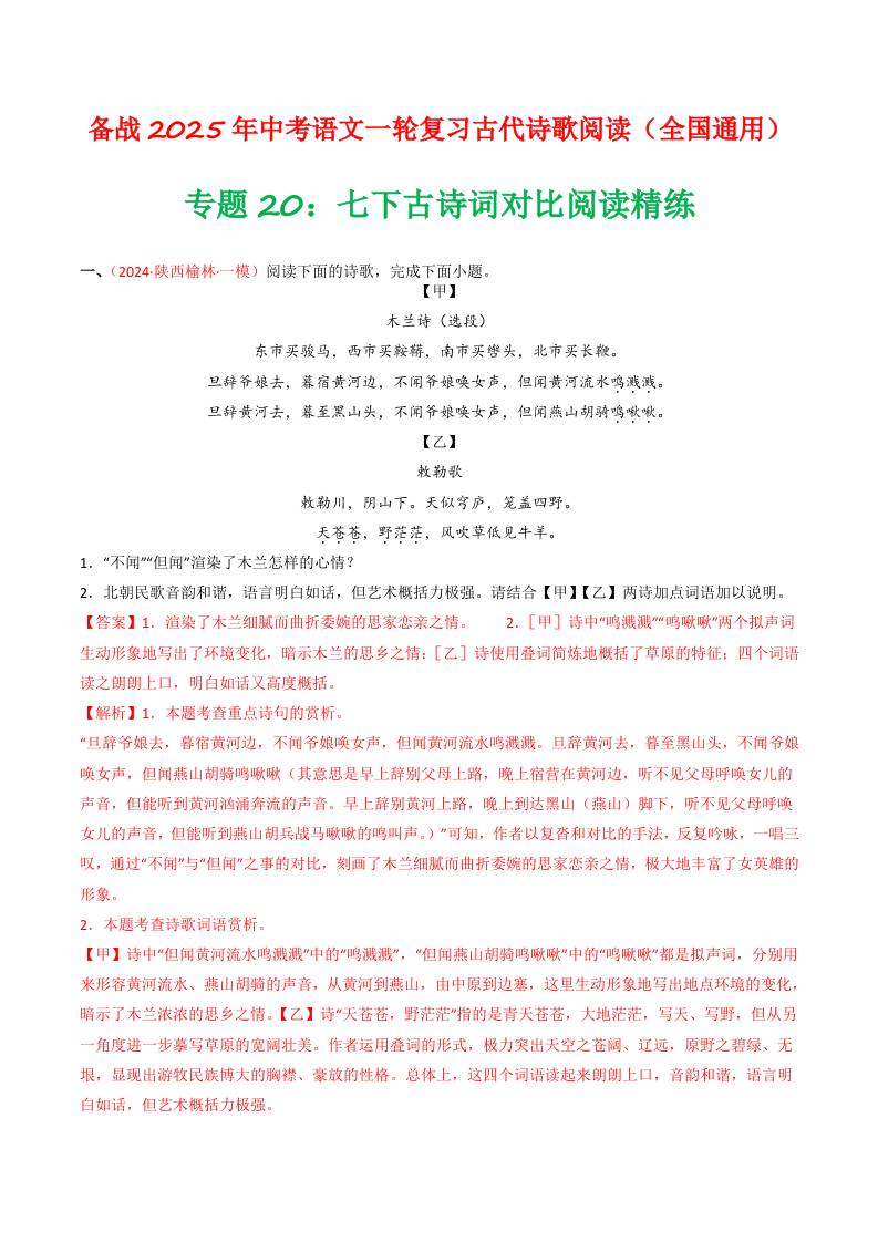 专题20:七下古诗词对比阅读精练-备战2025年中考语文一轮复习古代诗歌阅读(全国通用)解析版