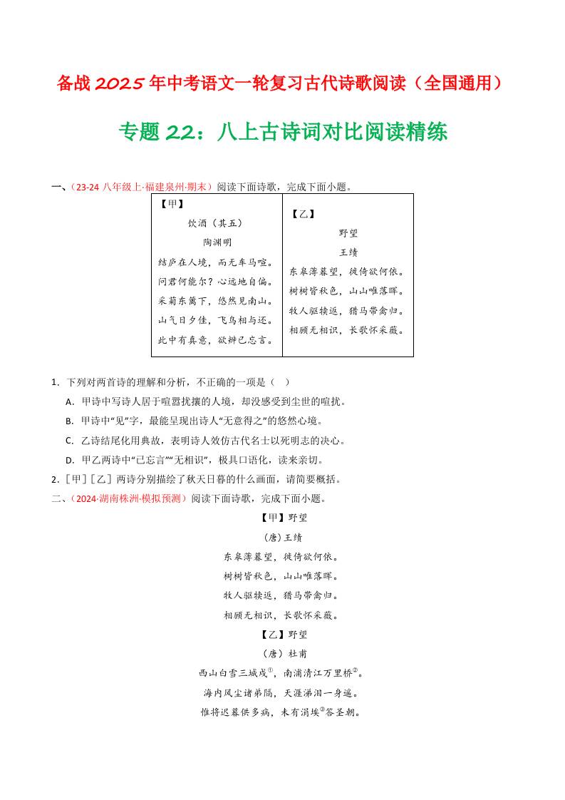 专题25:八下古诗词+文言文对比阅读精练-备战2025年中考语文一轮复习古代诗歌阅读(全国通用)原卷版