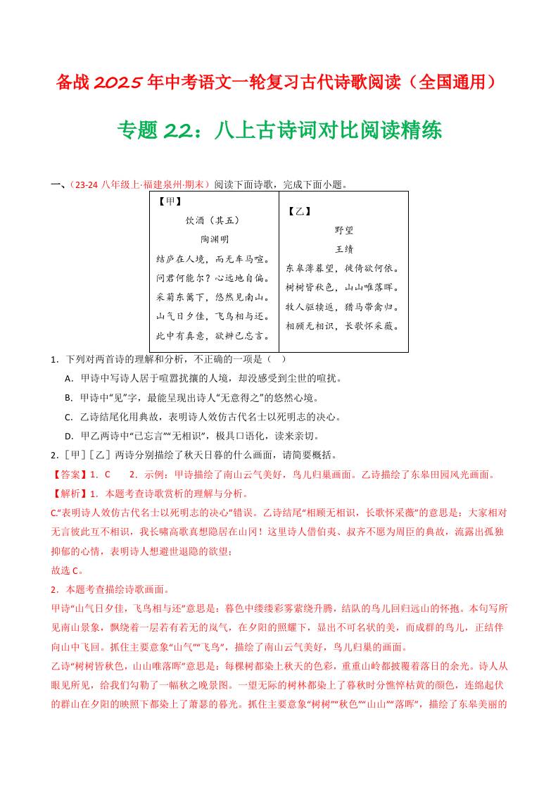 专题22:八上古诗词对比阅读精练-备战2025年中考语文一轮复习古代诗歌阅读(全国通用)解析版