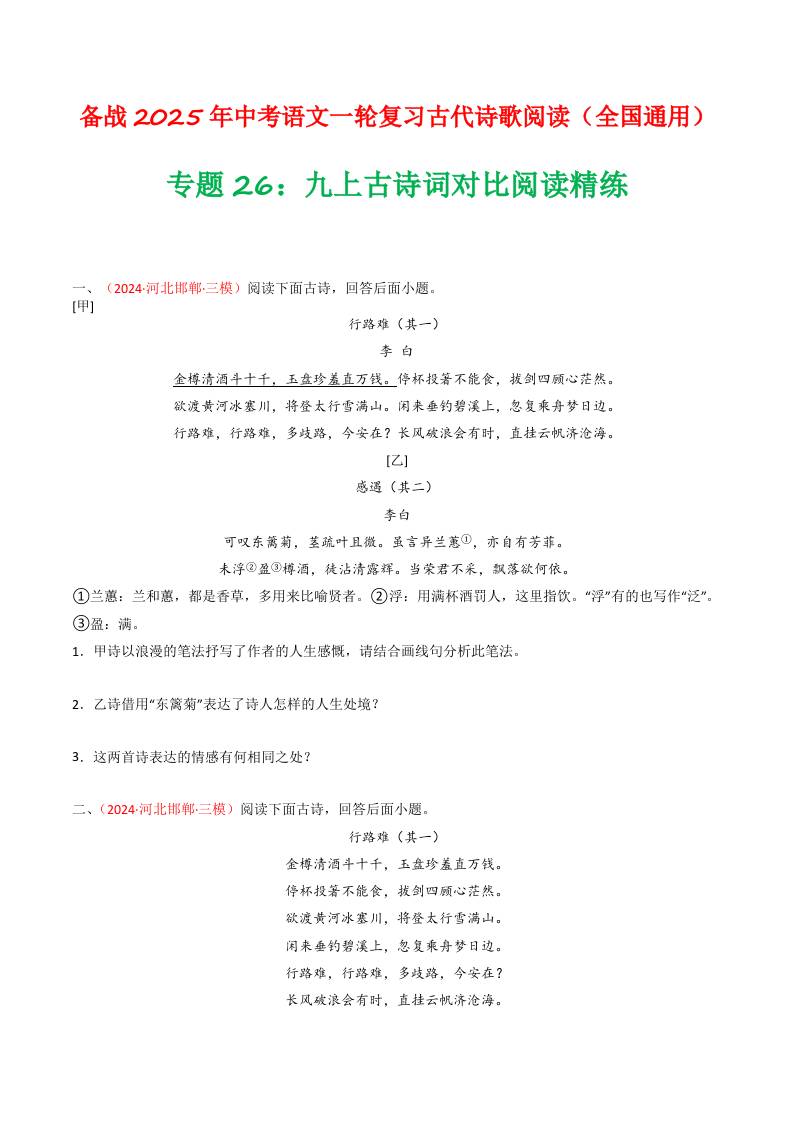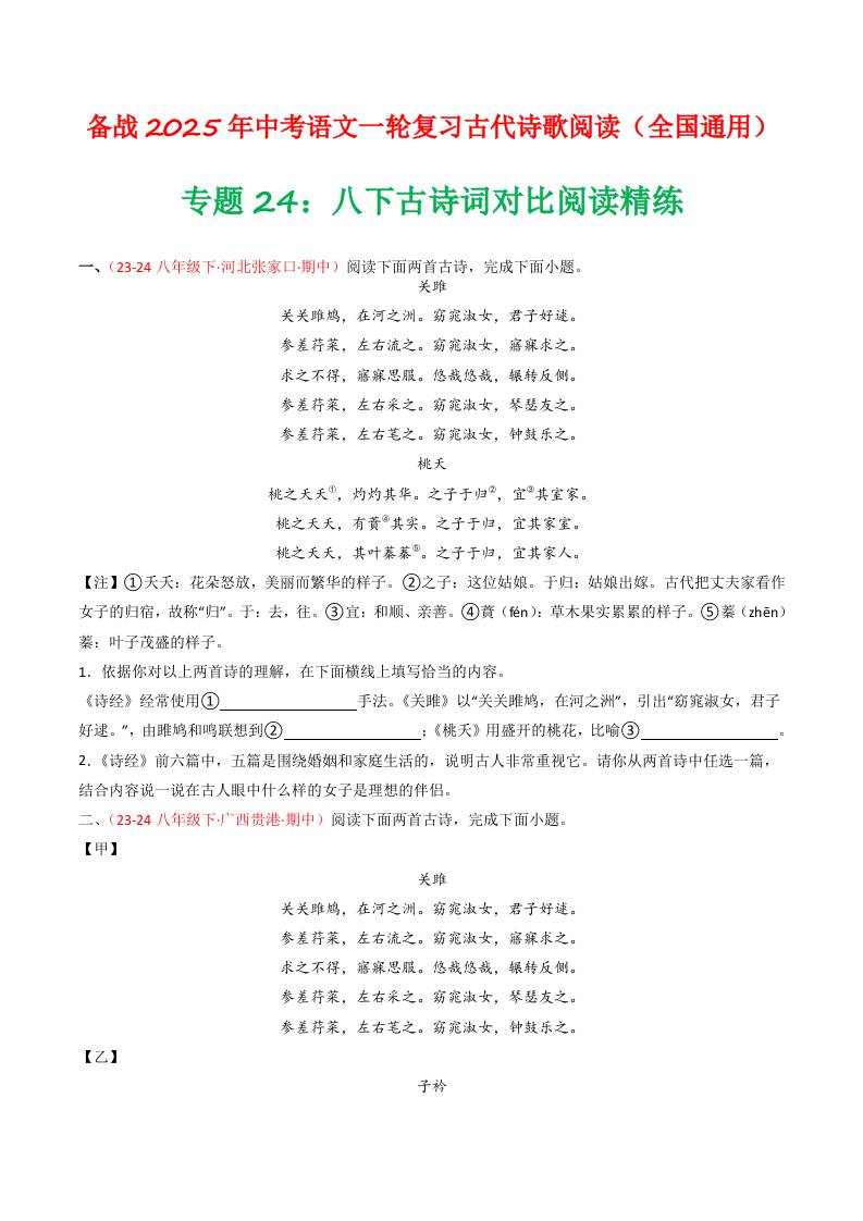 专题24:八下古诗词对比阅读精练-备战2025年中考语文一轮复习古代诗歌阅读(全国通用)原卷版