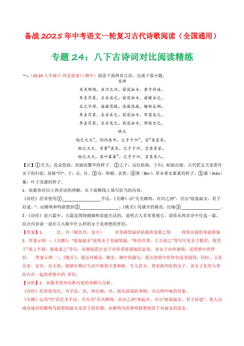 专题24:八下古诗词对比阅读精练-备战2025年中考语文一轮复习古代诗歌阅读(全国通用)解析版
