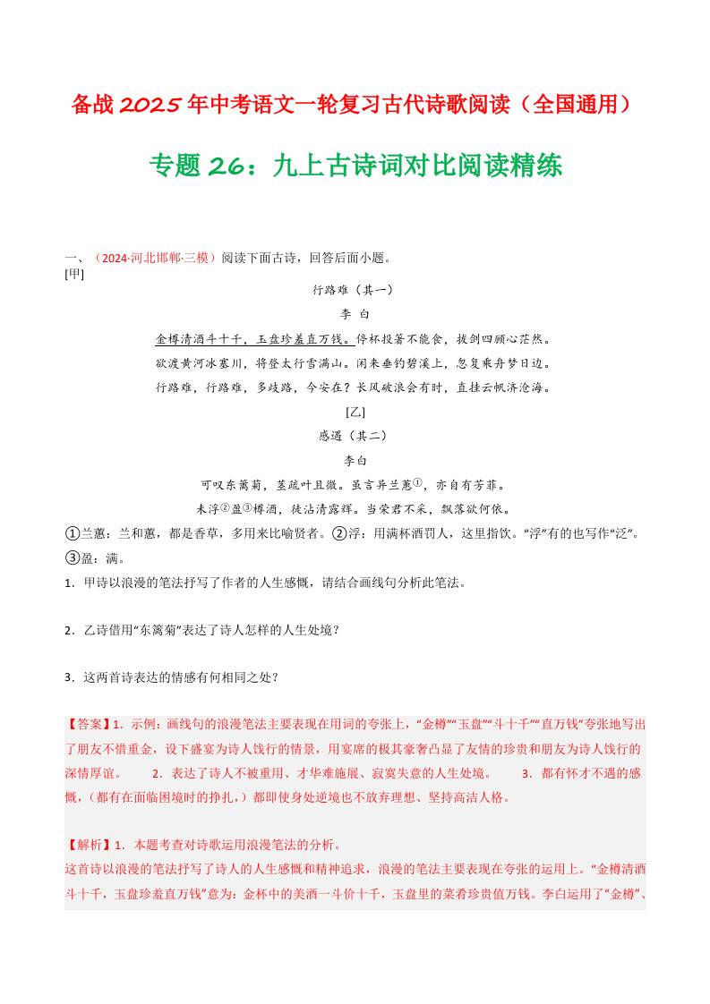 专题26:九上古诗词对比阅读精练-备战2025年中考语文一轮复习古代诗歌阅读(全国通用)解析版