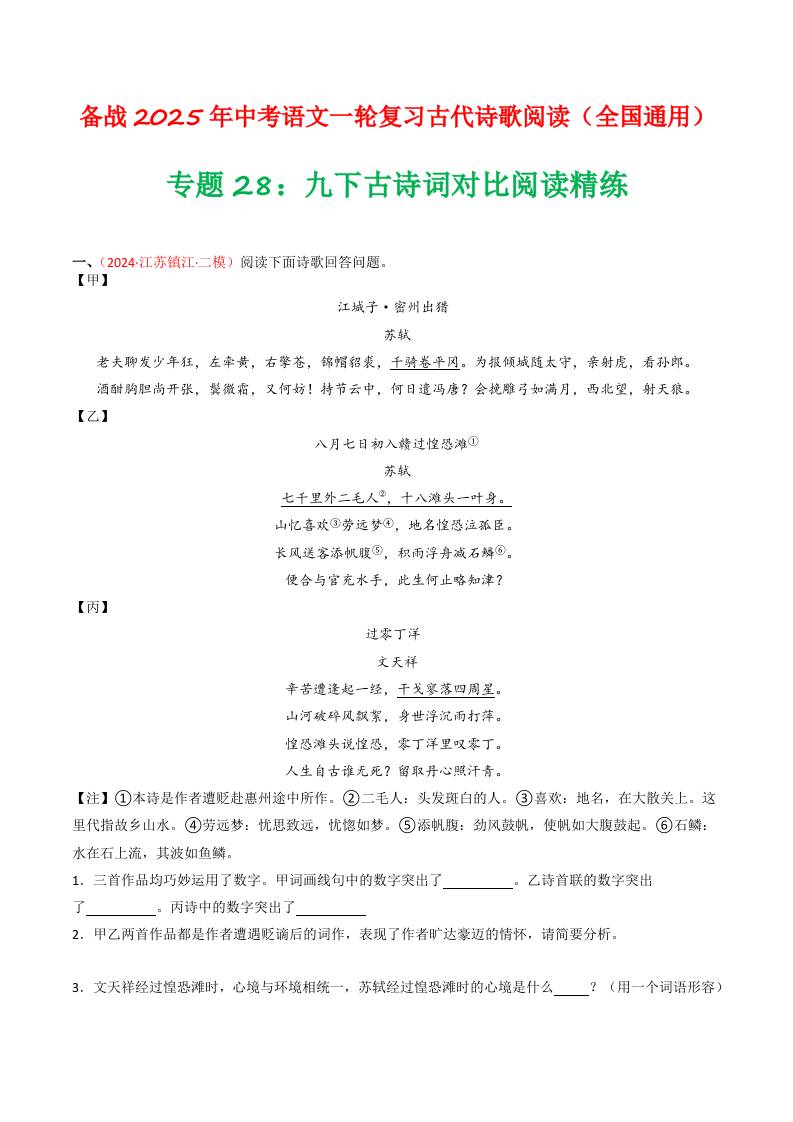 专题28:九下古诗词对比阅读精练-备战2025年中考语文一轮复习古代诗歌阅读(全国通用)原卷版