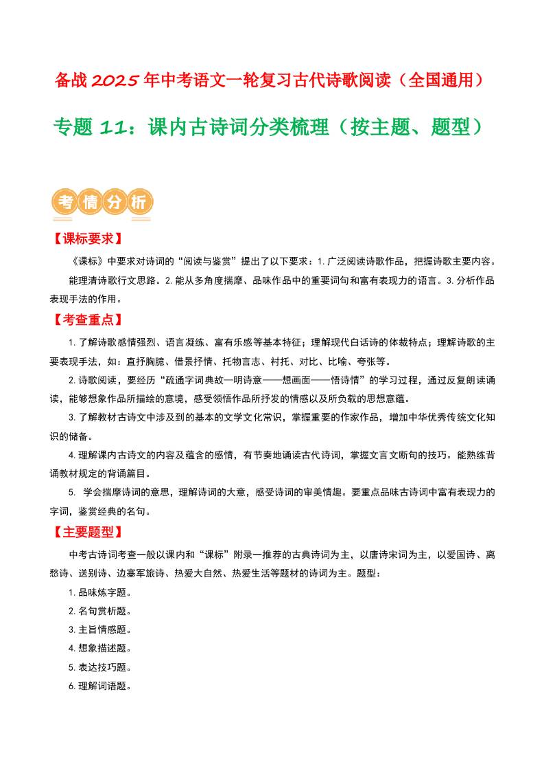 专题11:课内古诗词分类梳理(按主题、题型)-备战2025年中考语文一轮复习古代诗歌阅读(全国通用)原卷版