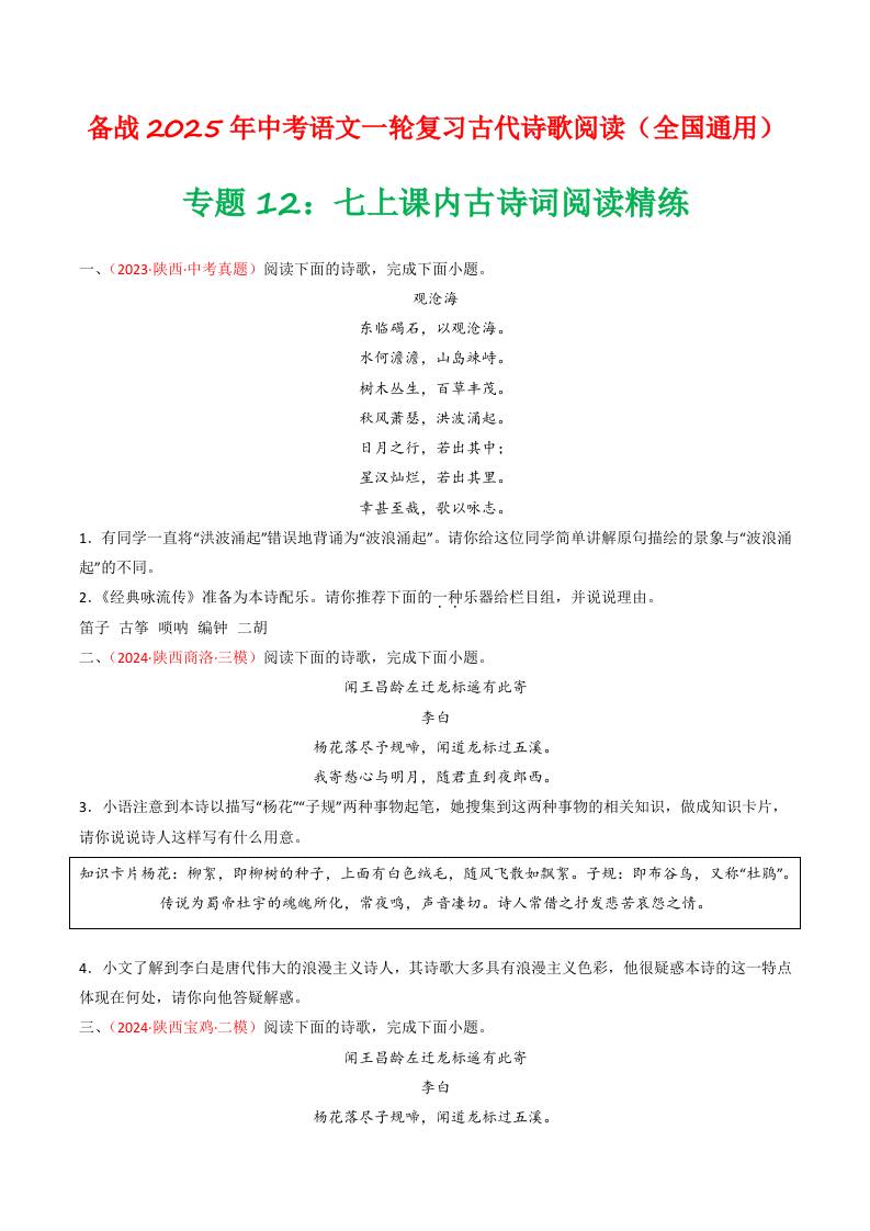 专题12:七上课内古诗词阅读精练-备战2025年中考语文一轮复习古代诗歌阅读(全国通用)原卷版