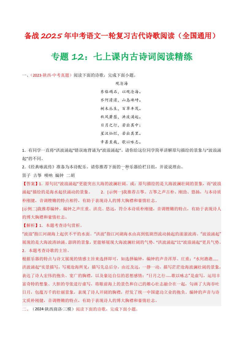 专题12:七上课内古诗词阅读精练-备战2025年中考语文一轮复习古代诗歌阅读(全国通用)解析版