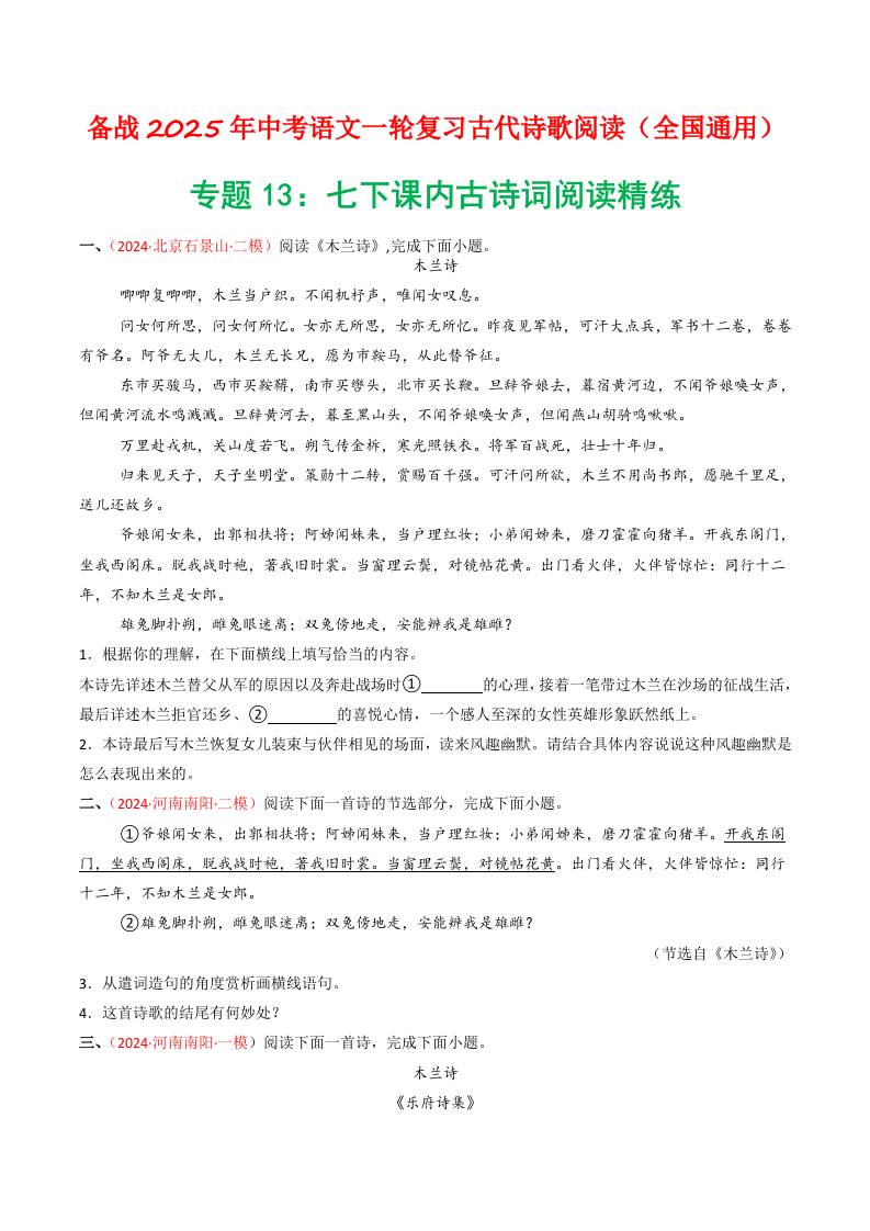 专题13:七下课内古诗词阅读精练-备战2025年中考语文一轮复习古代诗歌阅读(全国通用)原卷版