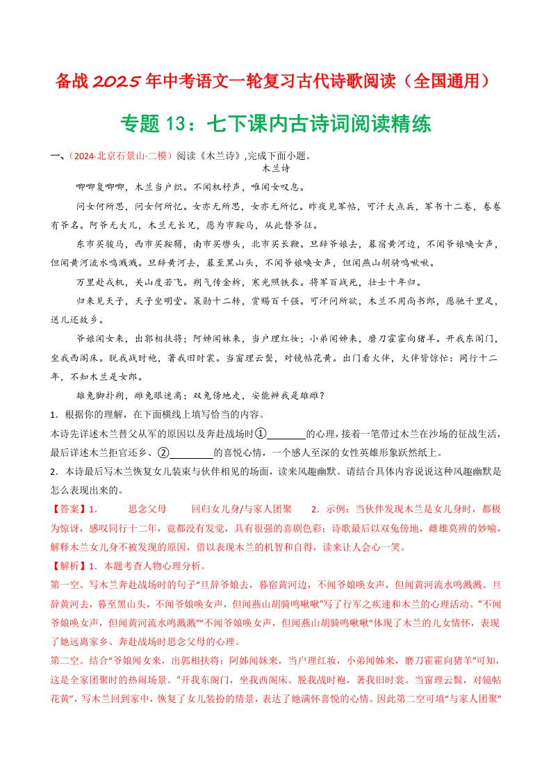专题13:七下课内古诗词阅读精练-备战2025年中考语文一轮复习古代诗歌阅读(全国通用)解析版