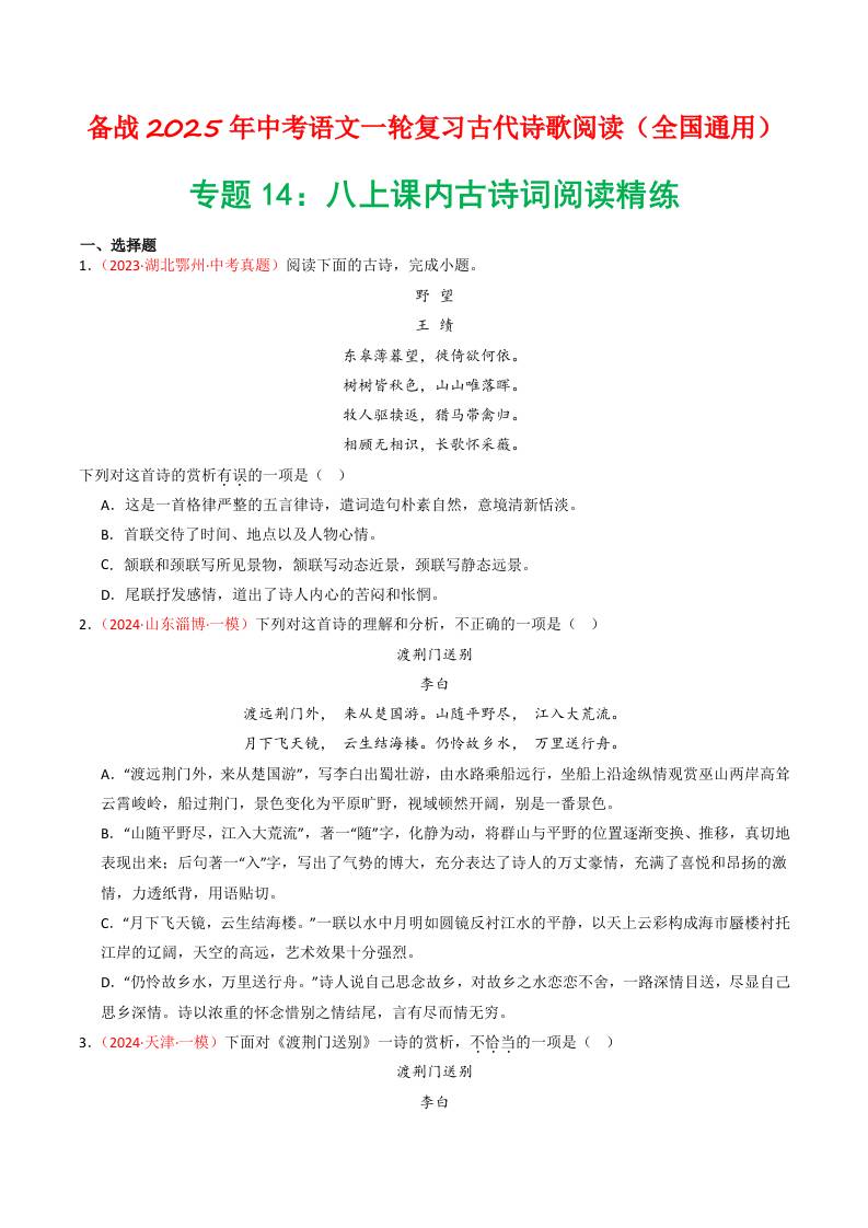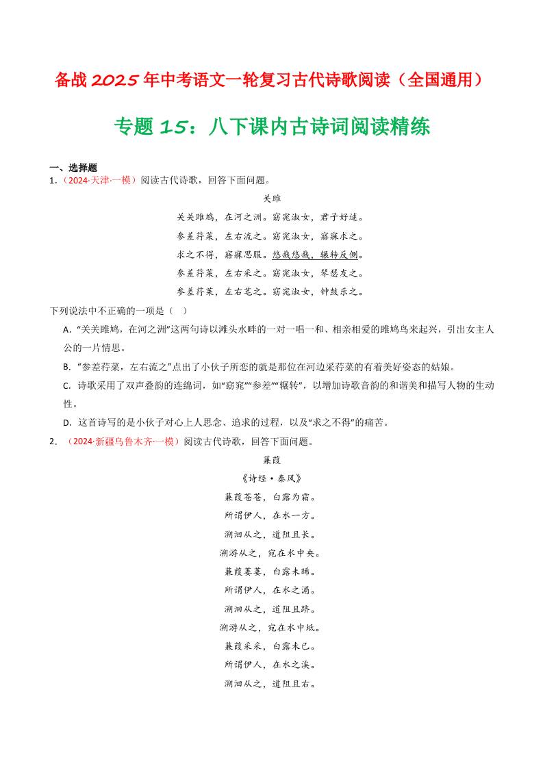 专题15:八下课内古诗词阅读精练-备战2025年中考语文一轮复习古代诗歌阅读(全国通用)原卷版