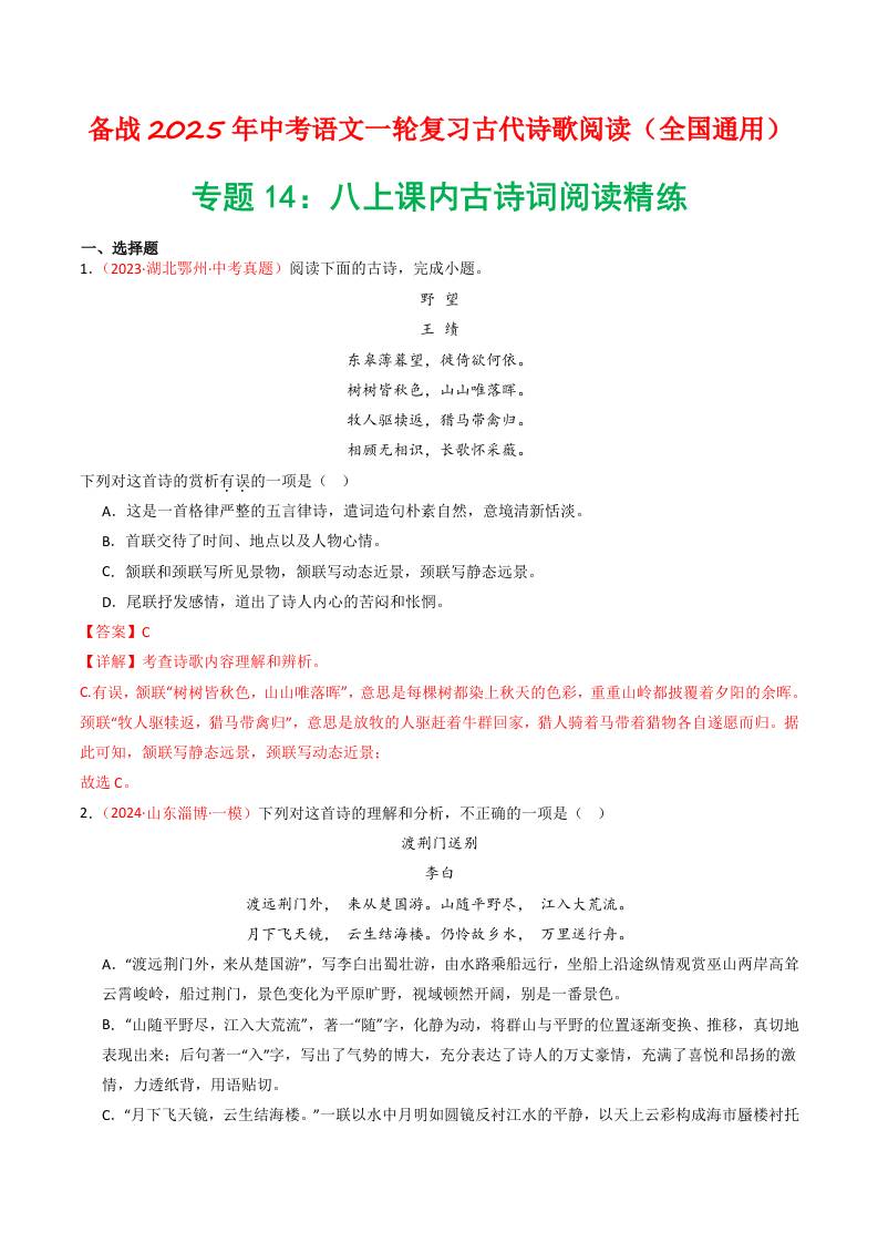 专题14:八上课内古诗词精练-备战2025年中考语文一轮复习古代诗歌阅读(全国通用)解析版