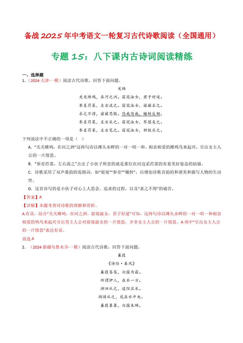 专题15:八下课内古诗词阅读精练-备战2025年中考语文一轮复习古代诗歌阅读(全国通用)解析版