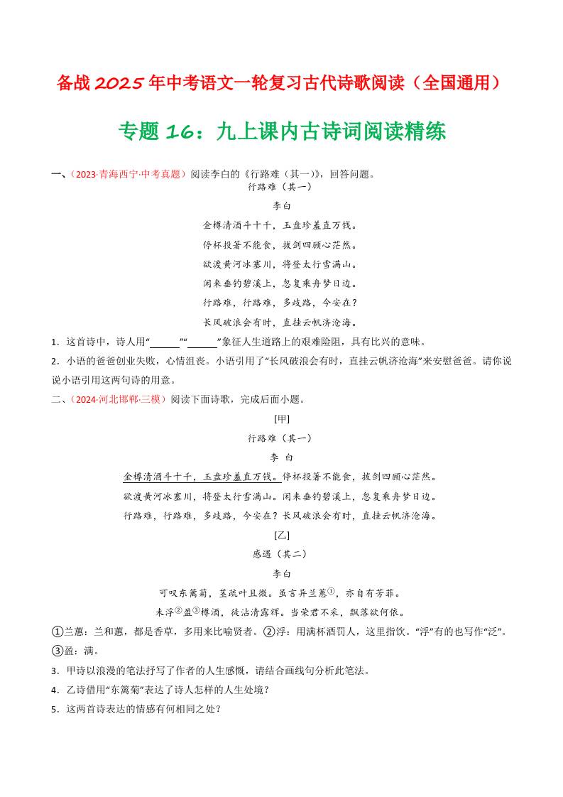 专题16:九上课内古诗词阅读精练-备战2025年中考语文一轮复习古代诗歌阅读(全国通用)原卷版