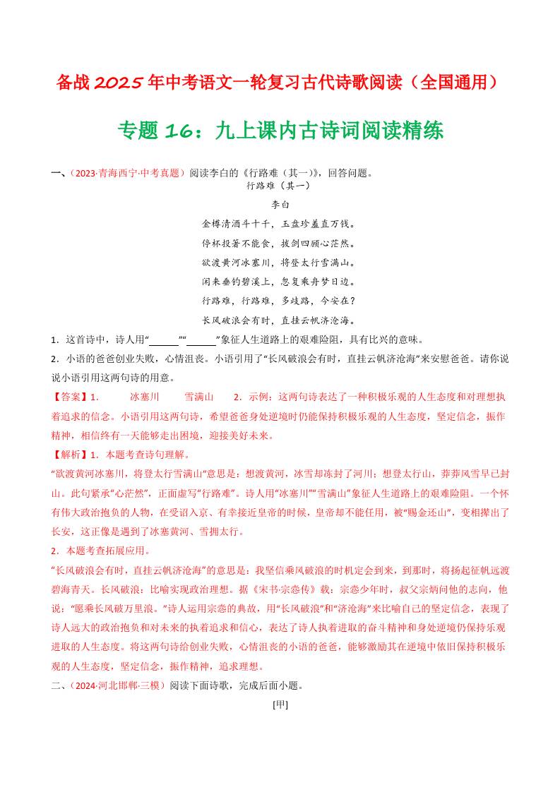 专题16:九上课内古诗词阅读精练-备战2025年中考语文一轮复习古代诗歌阅读(全国通用)解析版