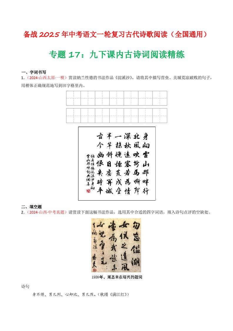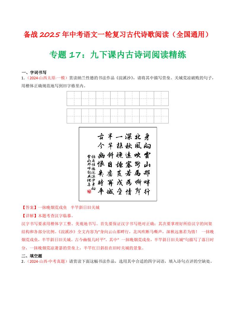 专题17:九下课内古诗词阅读精练-备战2025年中考语文一轮复习古代诗歌阅读(全国通用)解析版