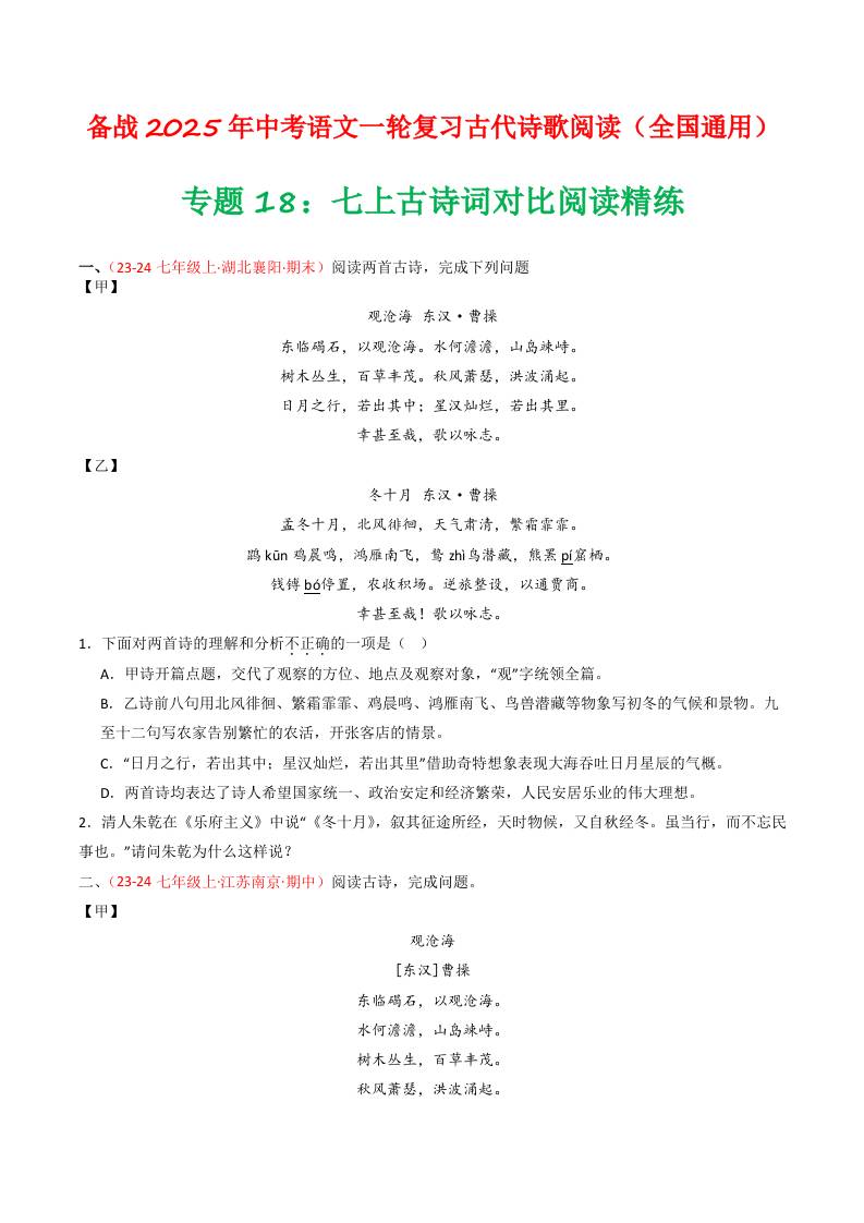 专题18:七上古诗词对比阅读精练-备战2025年中考语文一轮复习古代诗歌阅读(全国通用)原卷版