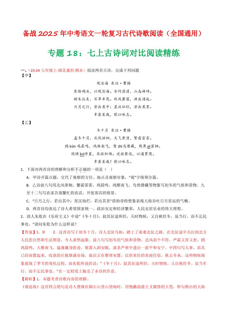 专题18:七上古诗词对比阅读精练-备战2025年中考语文一轮复习古代诗歌阅读(全国通用)解析版
