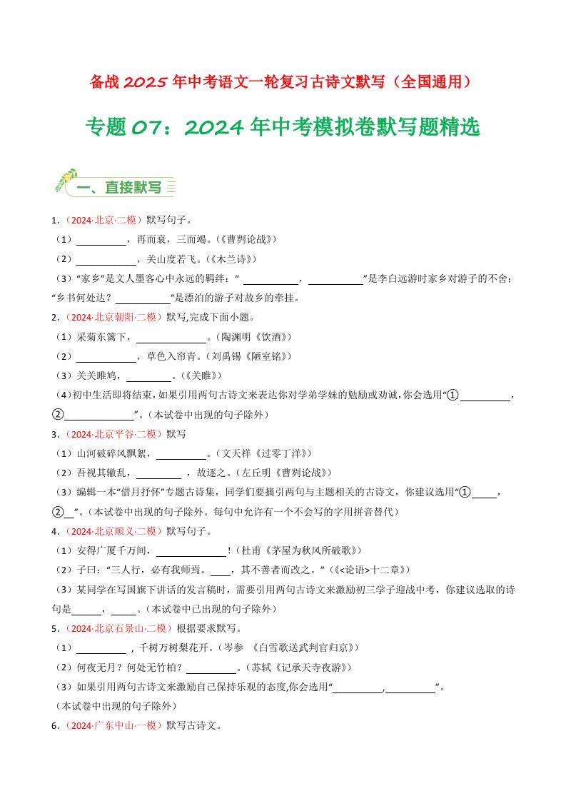 2024年中考模拟卷默写题精选-备战2025年中考语文一轮复习古诗文默写(全国通用)原卷版