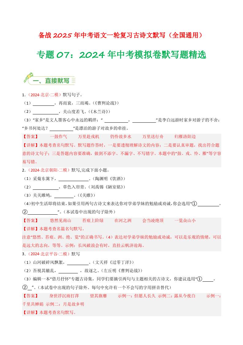 2024年中考模拟卷默写题精选-备战2025年中考语文一轮复习古诗文默写(全国通用)解析版