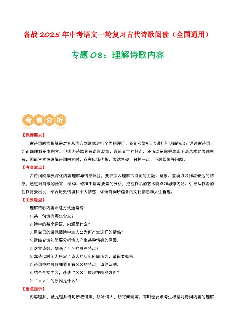专题08:理解诗歌内容-备战2025年中考语文一轮复习古代诗歌阅读(全国通用)原卷版