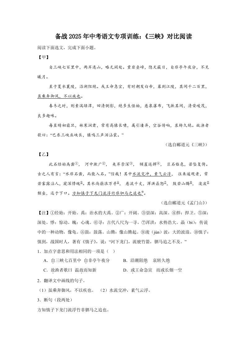 备战2025年中考语文文言文专项训练:《三峡》对比阅读(含答案)