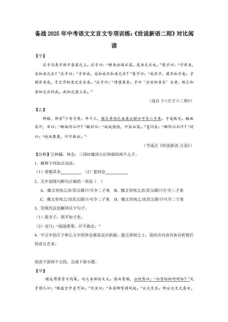 备战2025年中考语文文言文专项训练:《世说新语二则》对比阅读(含答案)