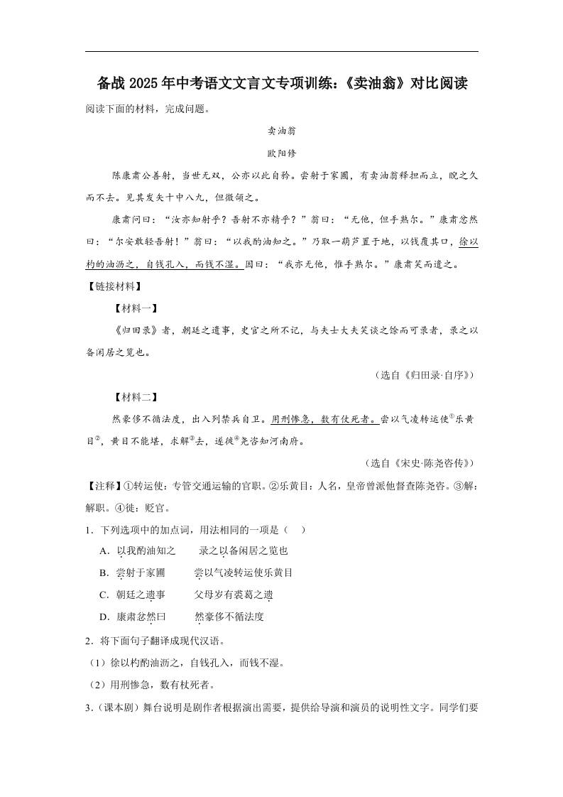 备战2025年中考语文文言文专项训练:《卖油翁》对比阅读(含答案)