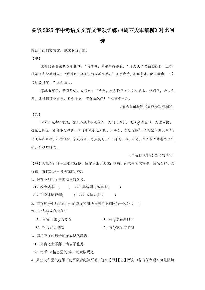 备战2025年中考语文文言文专项训练:《周亚夫军细柳》对比阅读(含答案)