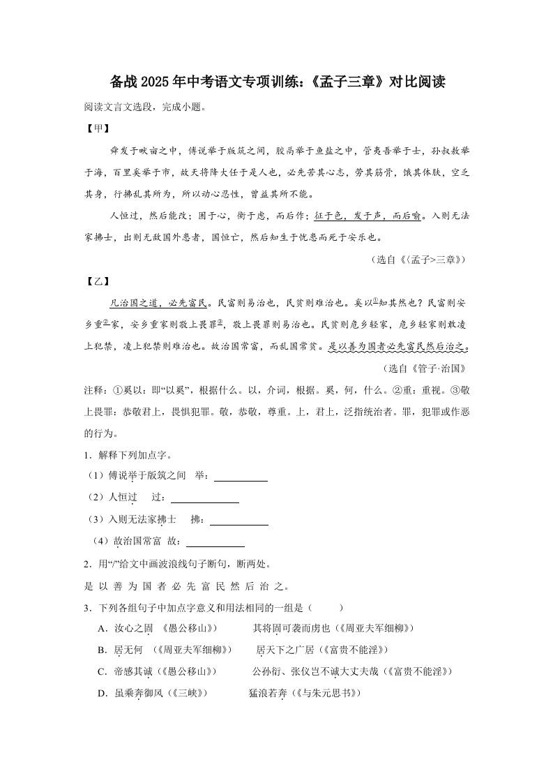 备战2025年中考语文文言文专项训练:《孟子三章》对比阅读(含答案)