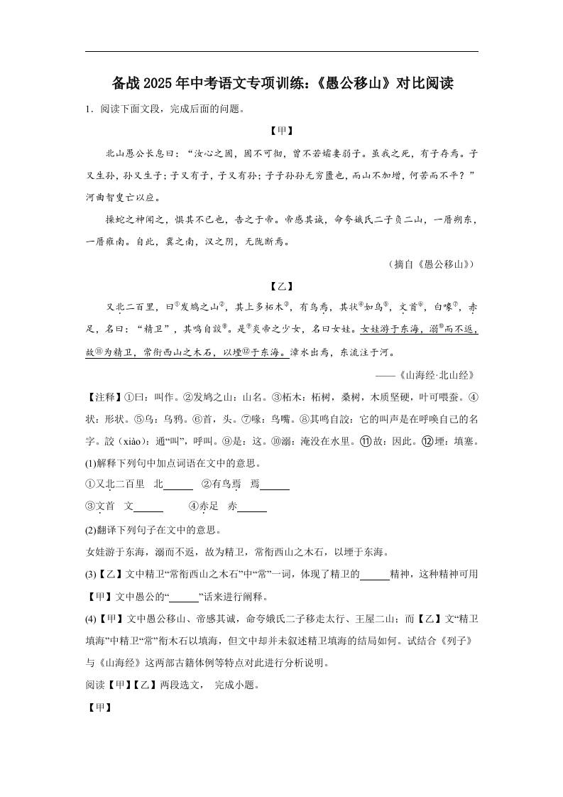 备战2025年中考语文文言文专项训练:《愚公移山》对比阅读(含答案) (1)