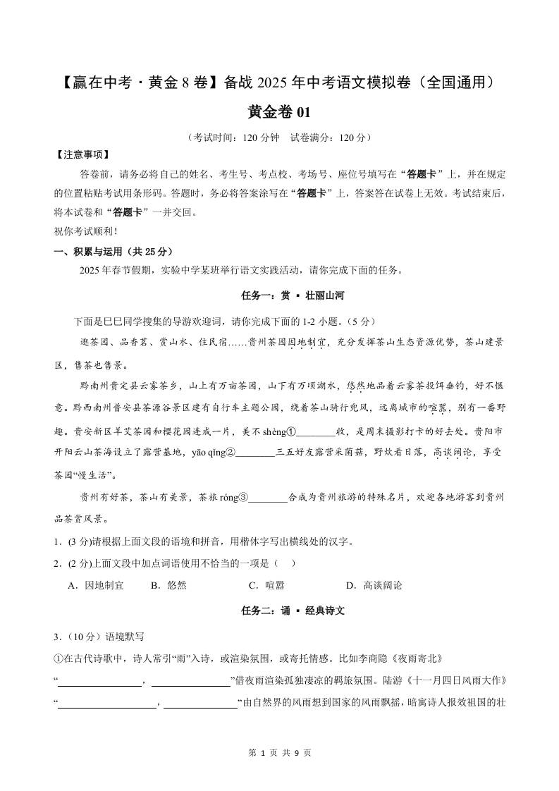 黄金卷01(全国通用)(考试版)