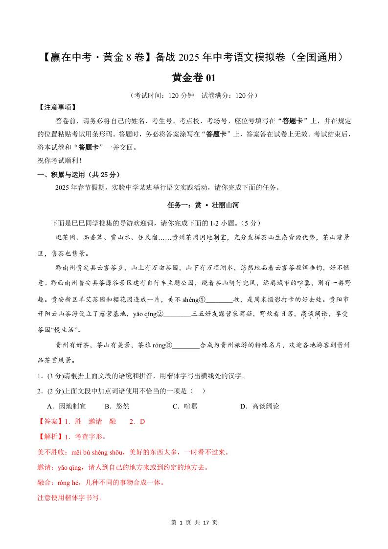 黄金卷01(全国通用)(解析版)