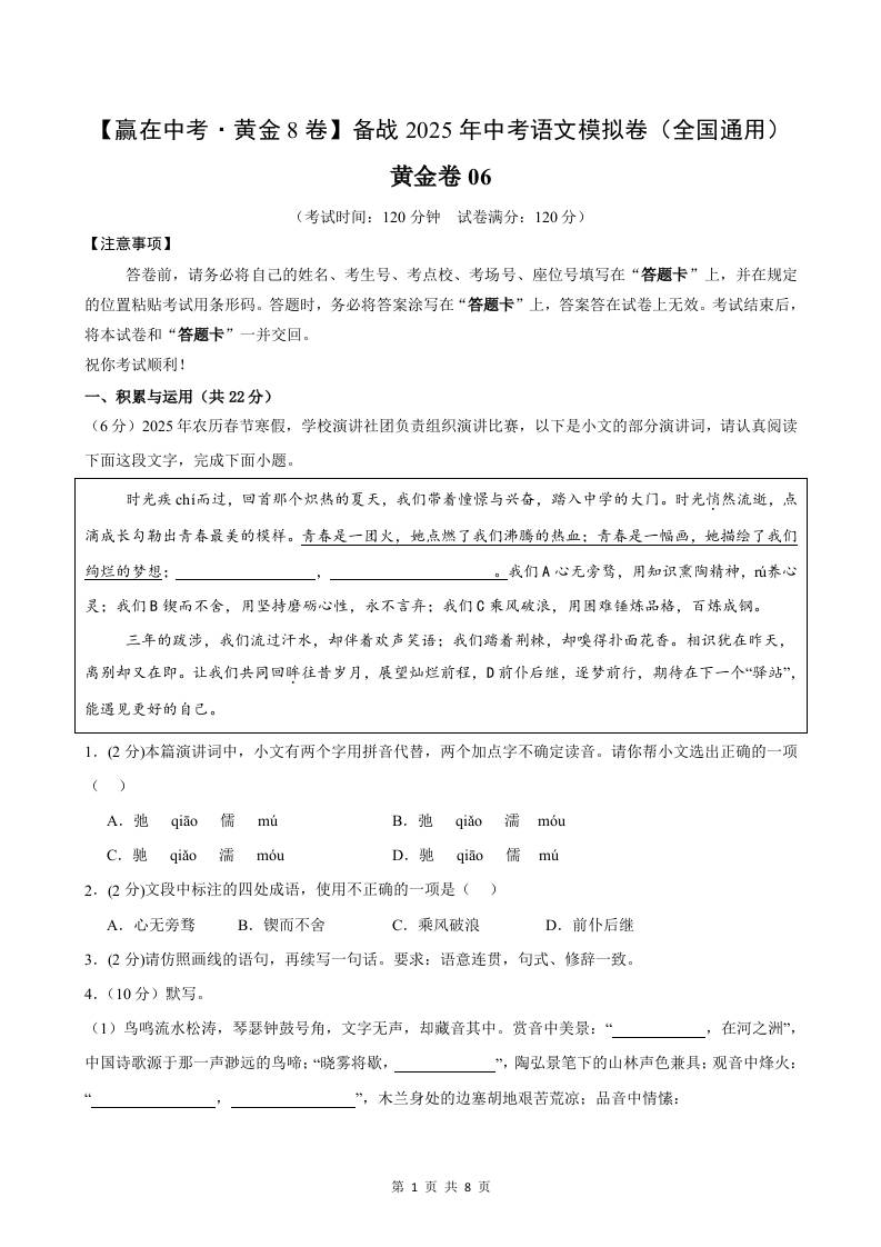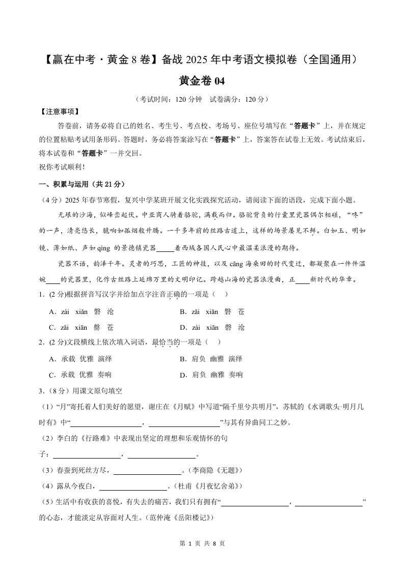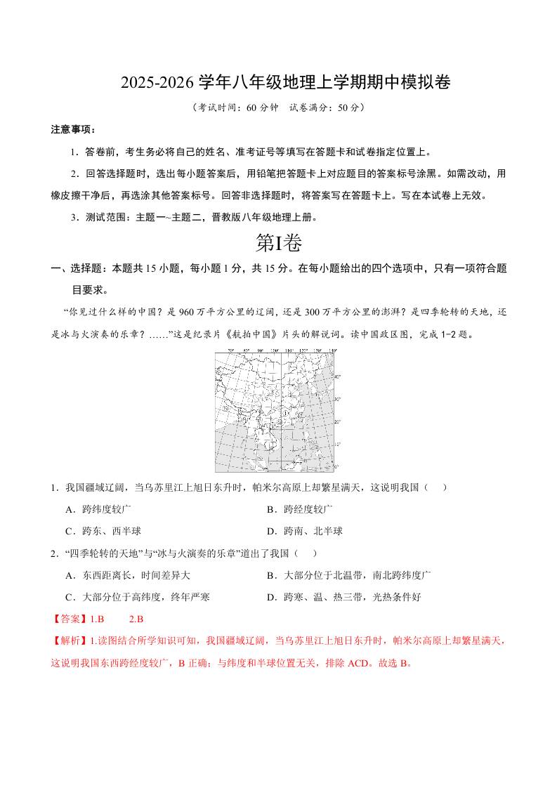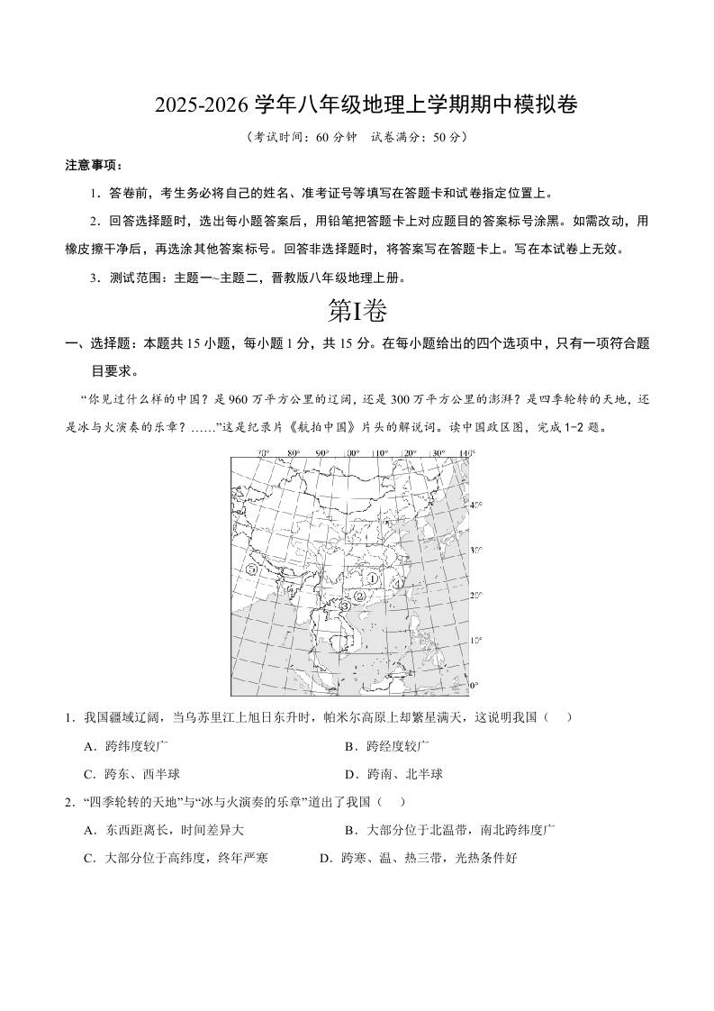 八年级地理上学期期中模拟卷【测试范围:晋教版主题1-主题3第一节】(考试版)
