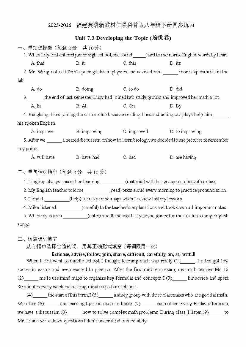 Unit 7 Developing the topic 同步练习(培优卷)2025-2026学年仁爱科普版八年级英语下册