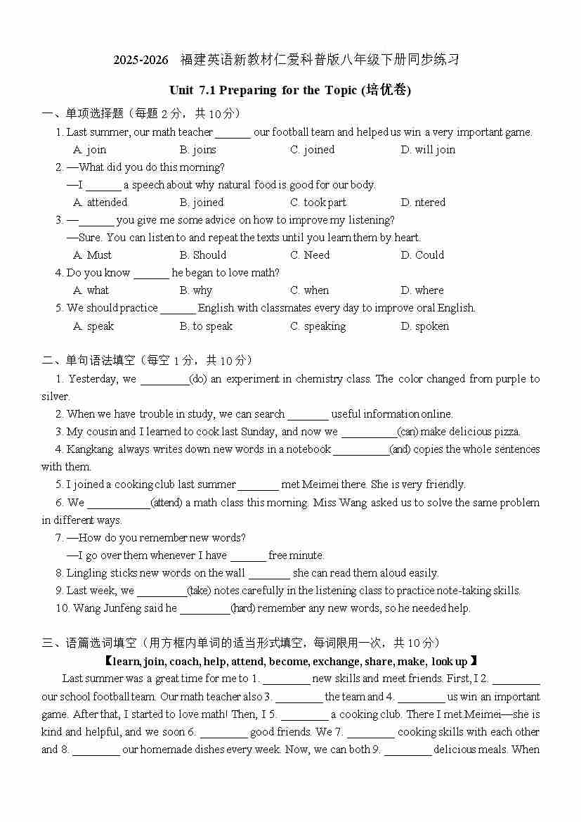 Unit 7 preparing for the topic 同步练习(培优卷)2025-2026学年仁爱科普版八年级英语下册