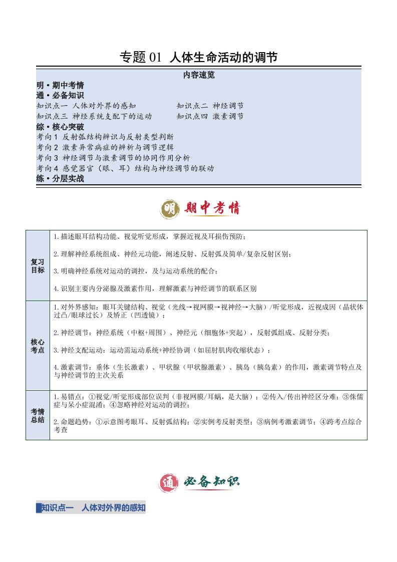 专题01 人体生命活动的调节(复习讲义)(学生版)