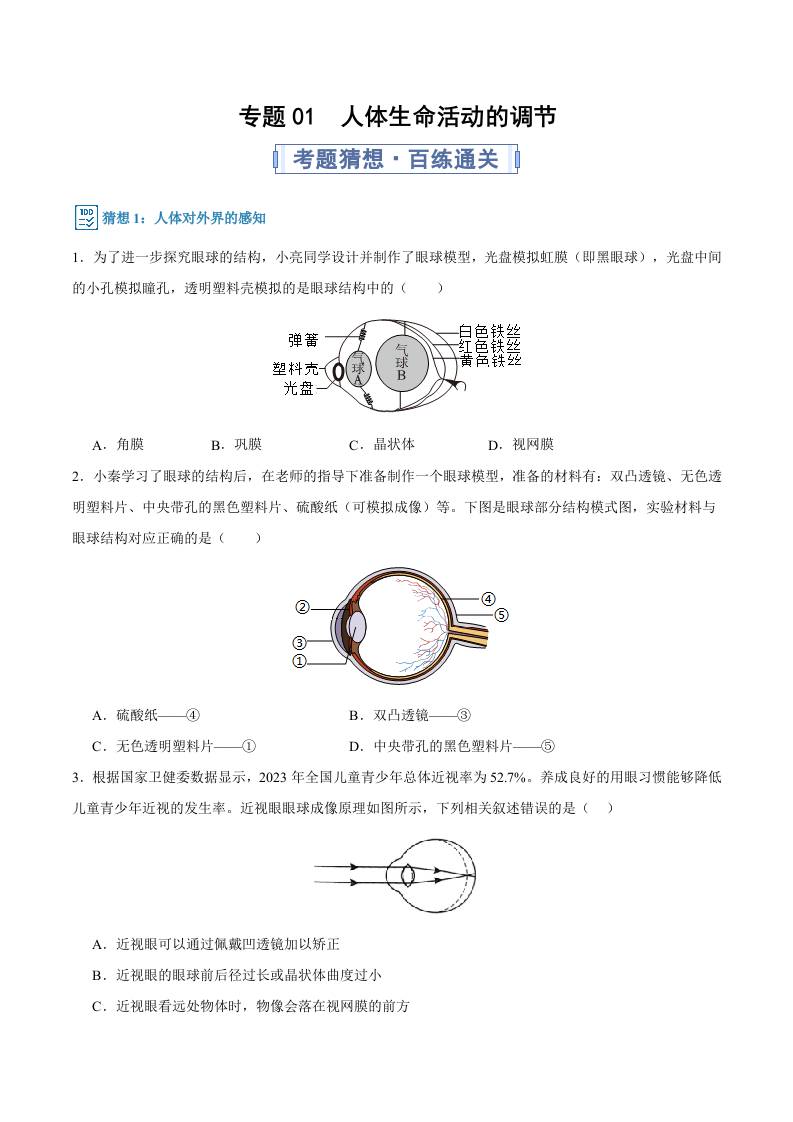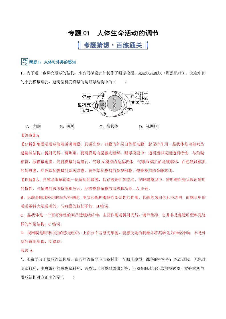 专题01 人体生命活动的调节(期中专项训练)(学生版)