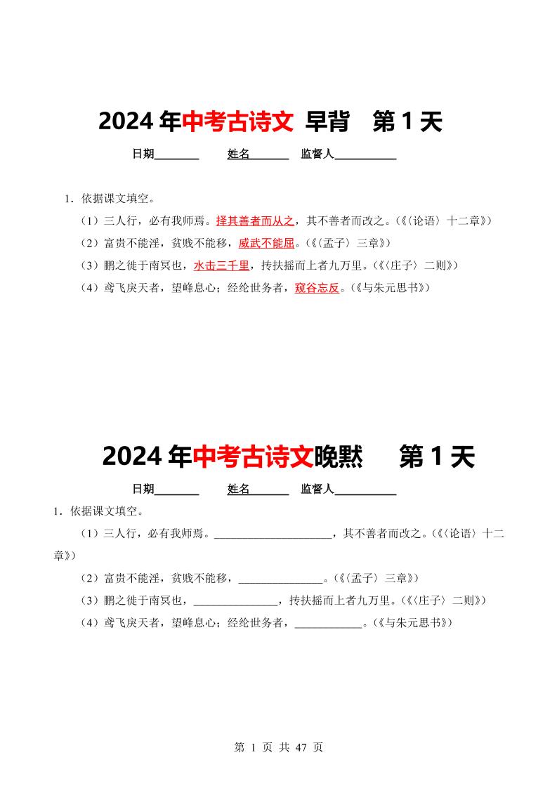 中考古诗文默写早背晚默46天