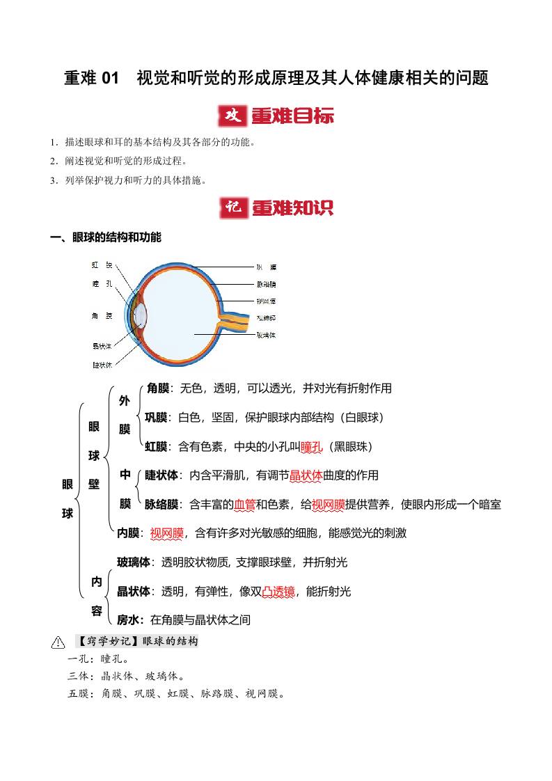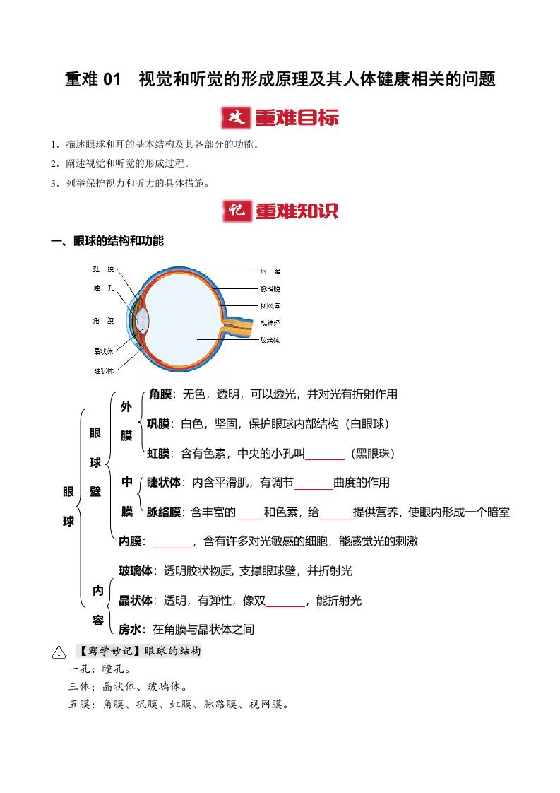 重难01 视觉和听觉的形成原理及其人体健康相关的问题(重难点突破讲义)(教师版)