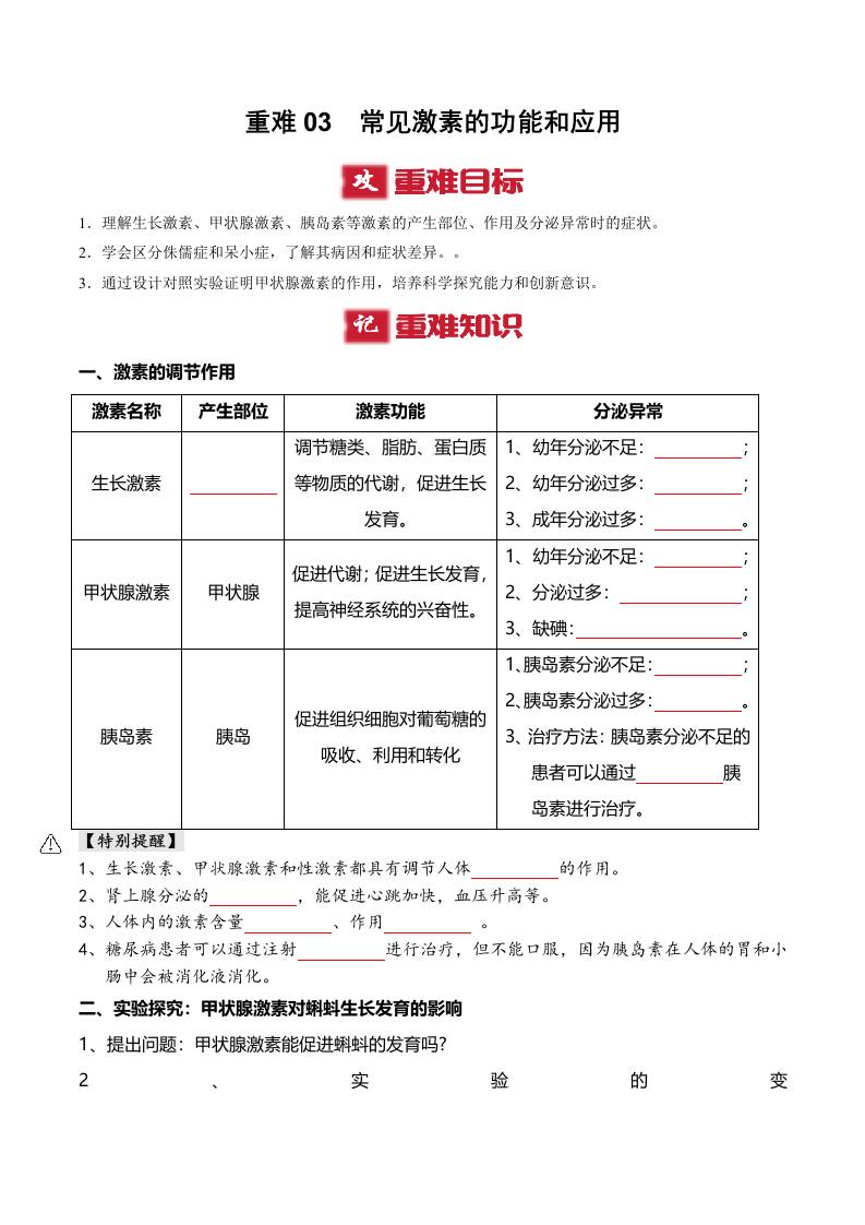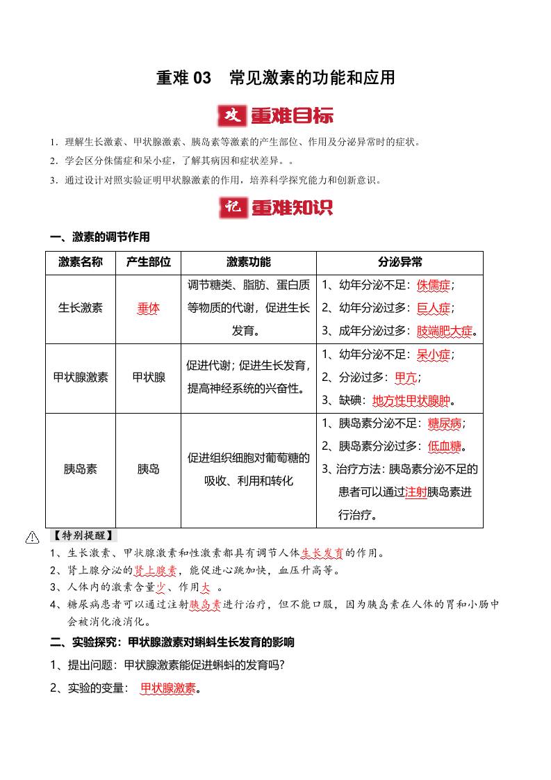 重难03 常见激素的功能和应用(重难点突破讲义)(学生版)
