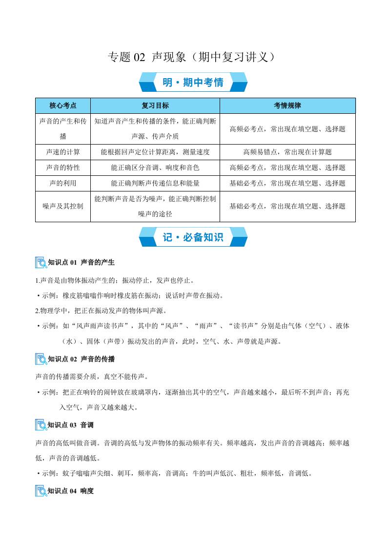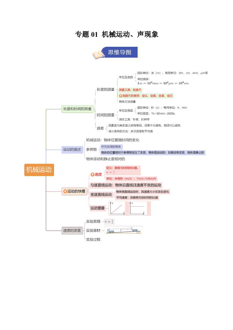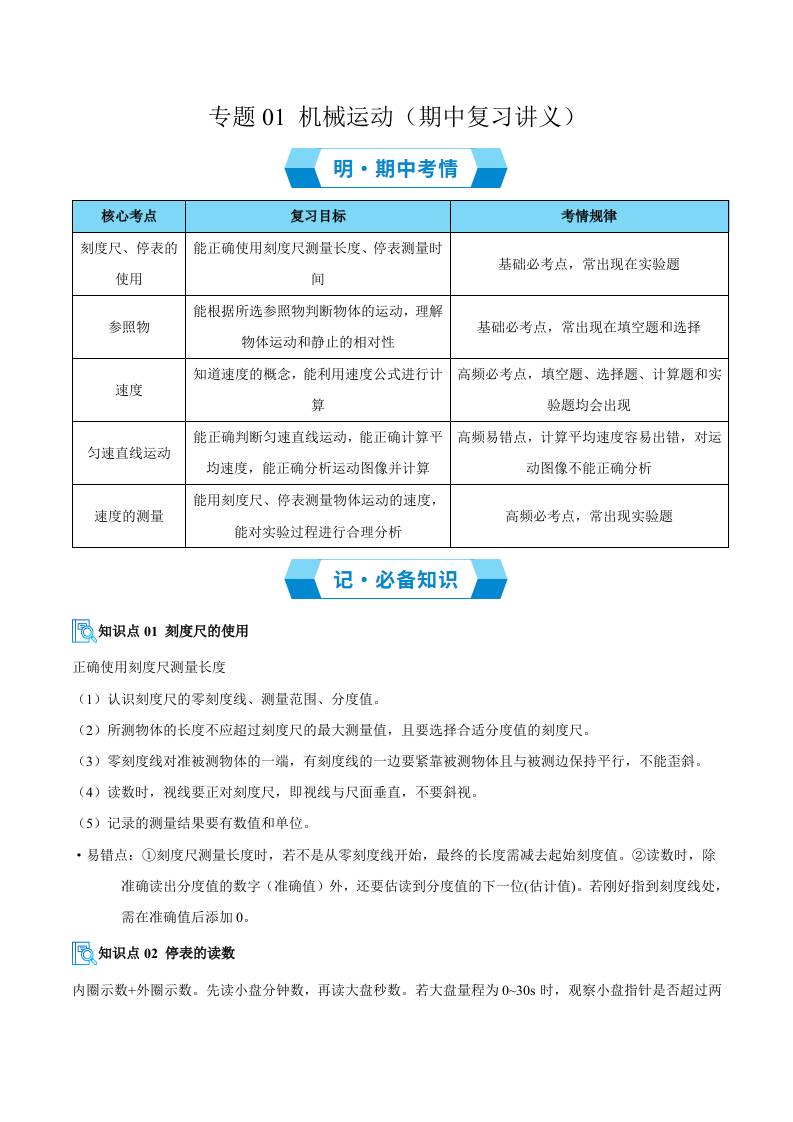 专题01 机械运动 声现象(期中知识清单)(学生版)